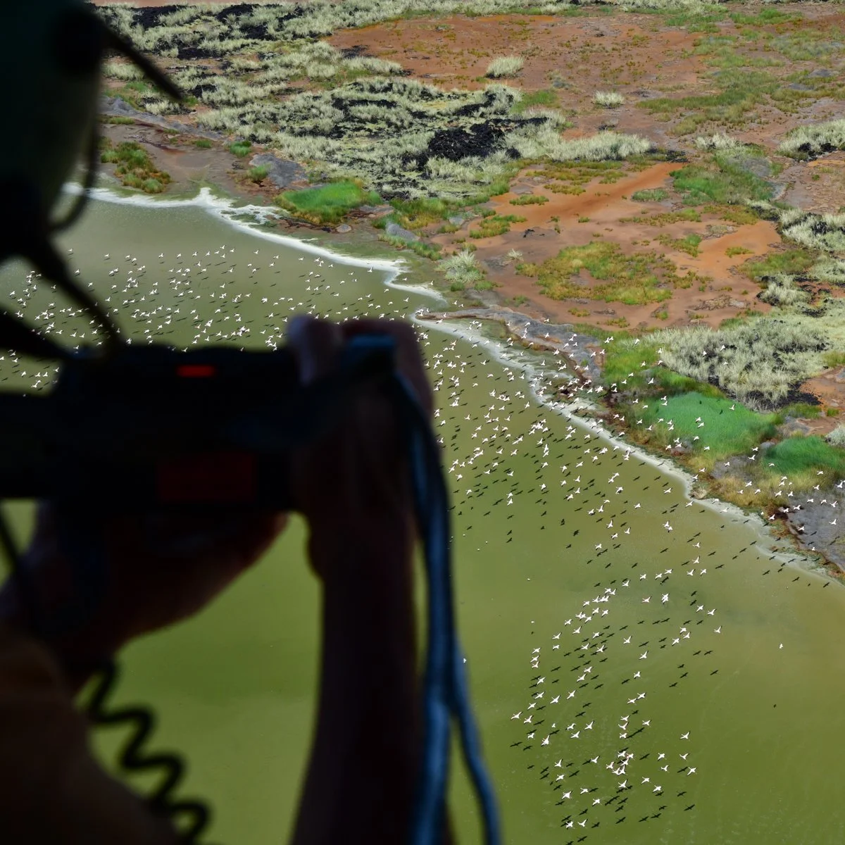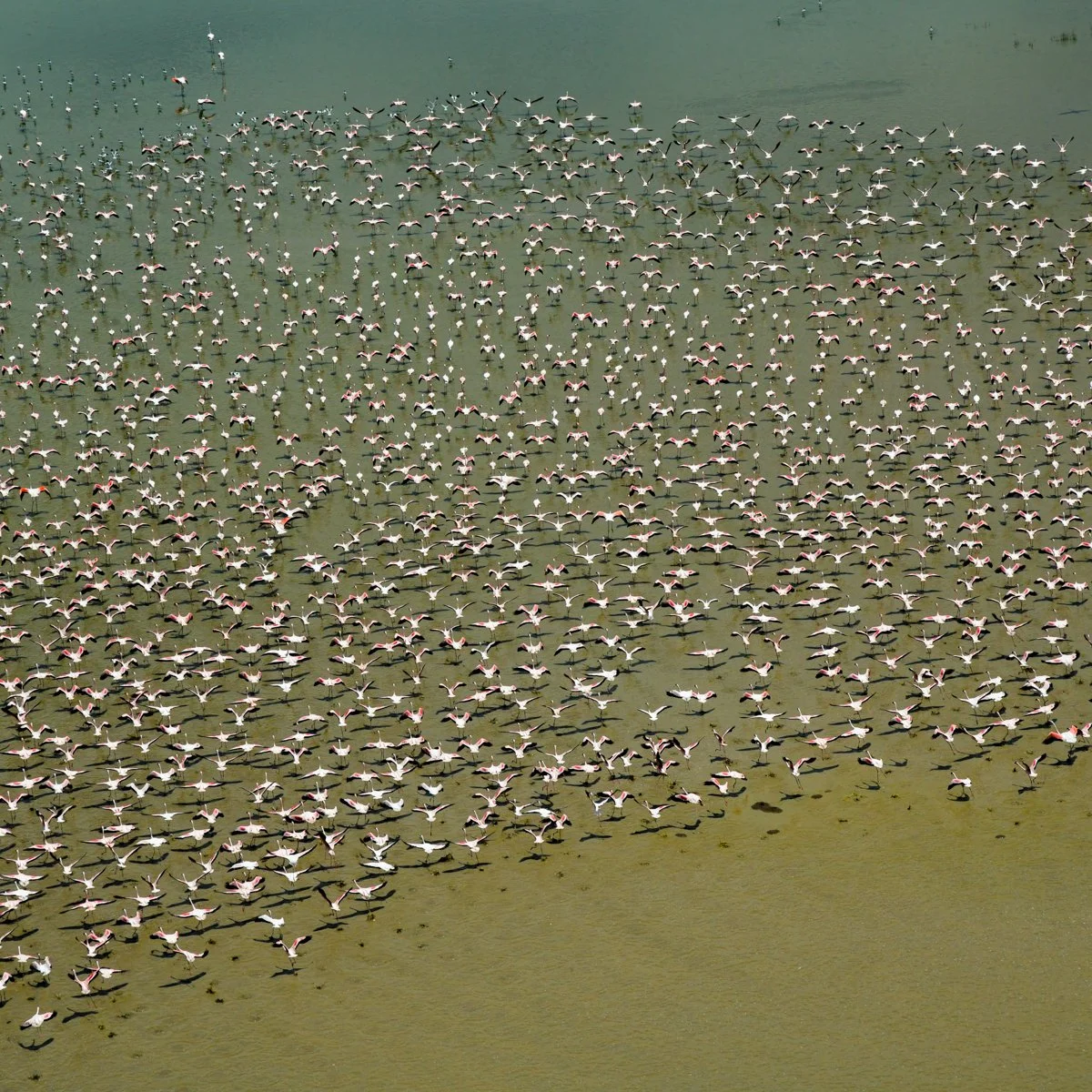 Continuing North we made it to the shores of Logipi, a shallow alkaline lake that receives all its water from hot springs and runoff which floes north up the Sukuta Valley. The saline lake with no outlet, supports enormous numbers of Flamingos who feed principally on the Cyanobacteria, one of our planets most significant and earliest life forms (Cyanobacteria filled our atmosphere with Oxygen as you may remember from Biology. Without Cyanobacteria there is no complex life, no humans, plants or animals, just anaerobic microbes). When we flew over, enormous numbers of flamingoes took flight, their pink contrasting most elegantly with the different tones of browns and greens in the water.