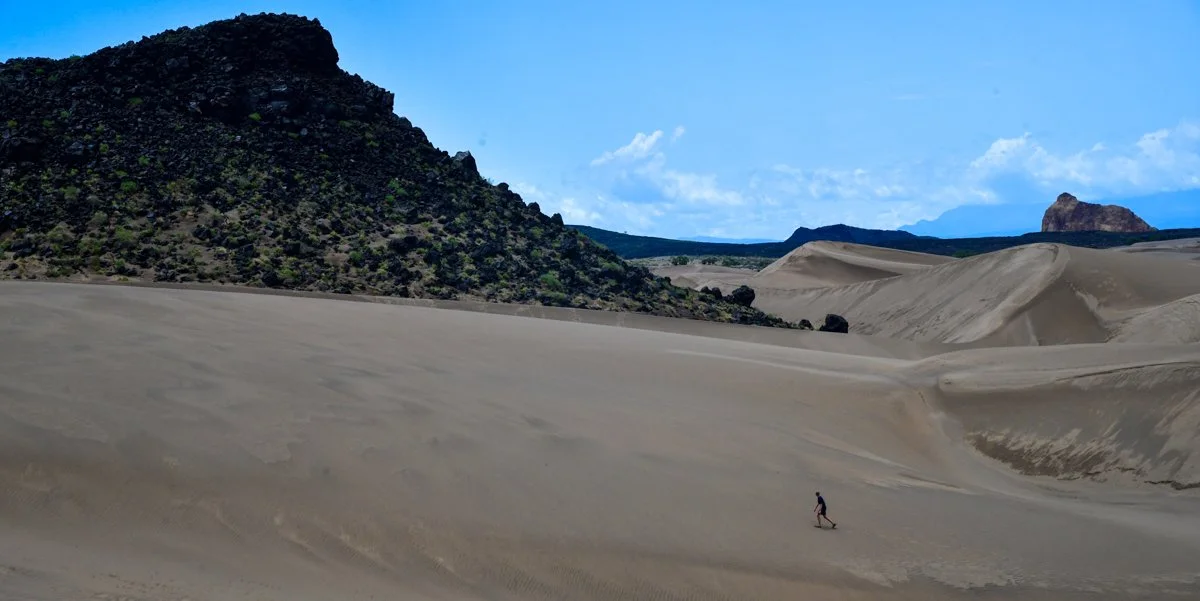 Beyond the water flows were the stunning Sukuta sand dunes that deserved a stop. A comparison to Dune is inevitable and like the marks left by the giant worms, recent whirlygigs caused by rising air, had left countless beautiful strokes and patterns. Beside the sand dunes stood the dark Aruba Rock, a black lava cone that also conjured something from science fiction. In the far background a bright yellow monolith stood of what I understand to be Volcanic Tuffs, high in Iron and Sulphur. One thing was for sure. It made a very dramatic hillside as we passed it by.